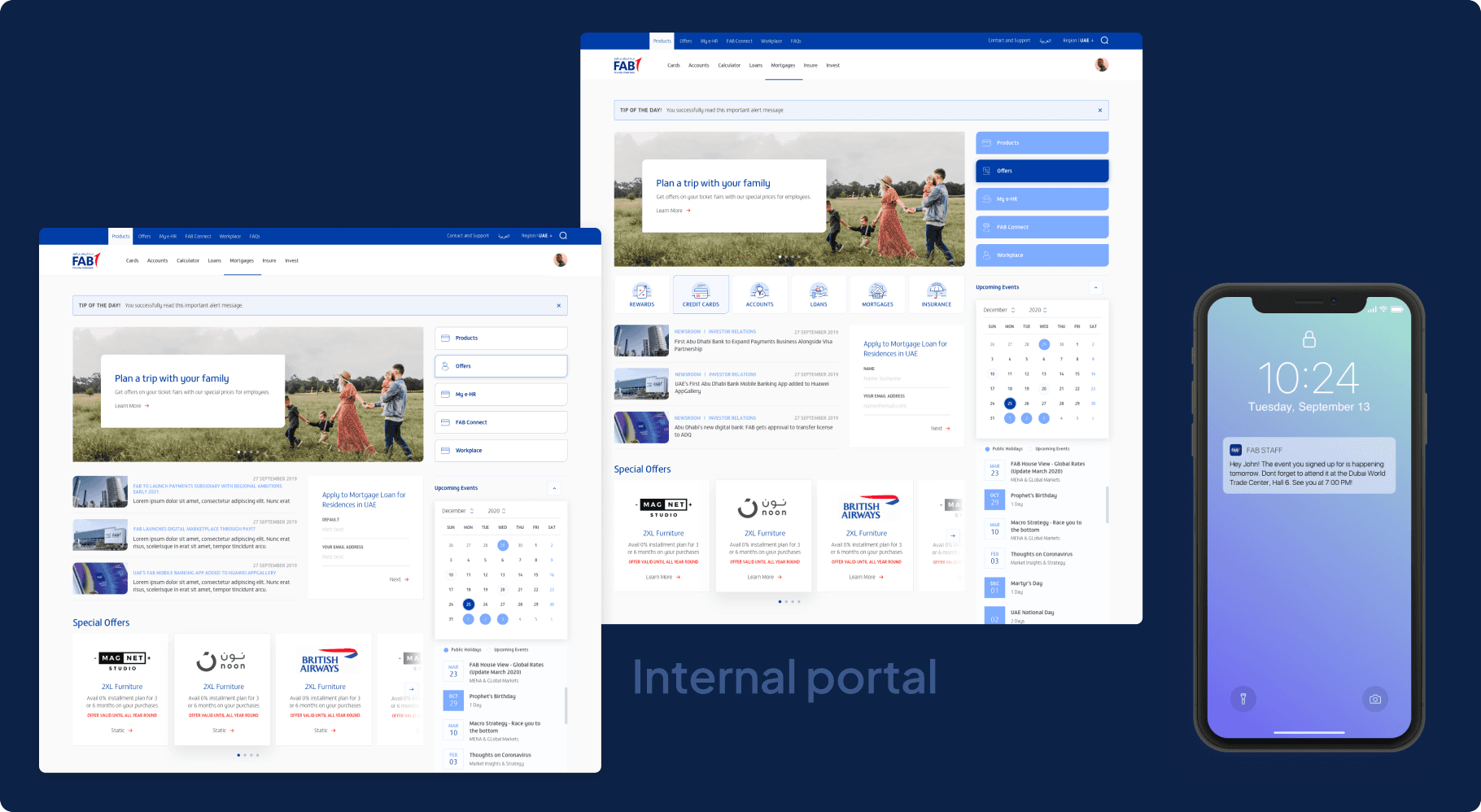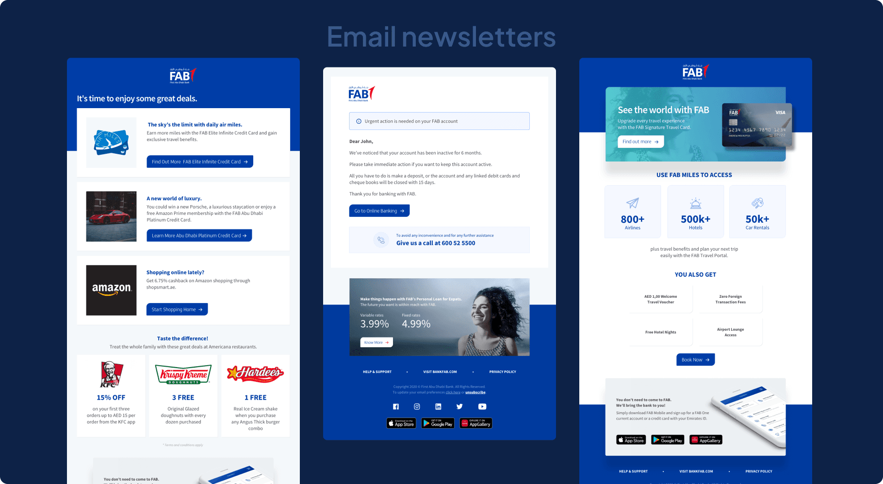 As the sole designer assigned to FAB through the agency, I worked across multiple digital touchpoints, marketing website, internal portal interfaces, Arabic mobile app, email communications, and a unified design system.