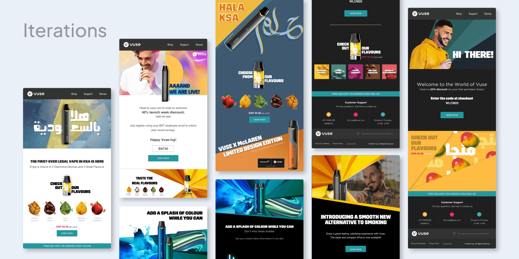 As the lead designer on the Vuse account at Mirum, I worked across website and lifecycle marketing touchpoints for the GCC region. My role focused on translating a bold, high-energy brand into cohesive digital experiences, while navigating cultural nuances across multiple markets.